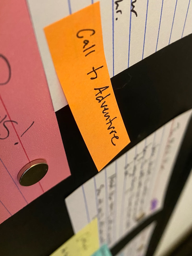 A close-up of Jon’s magnetic board. Using mini Post-it notes, he often marks the 17-steps of the Hero’s Journey at their corresponding points in the story.