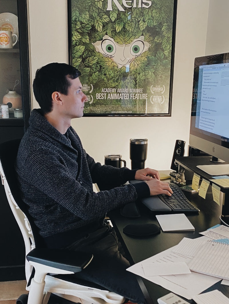 Jon in his favorite writing chair, typing out an early draft for Please Return to the Lands of Luxury.